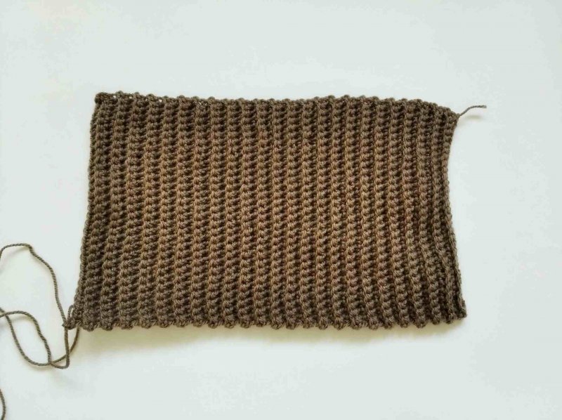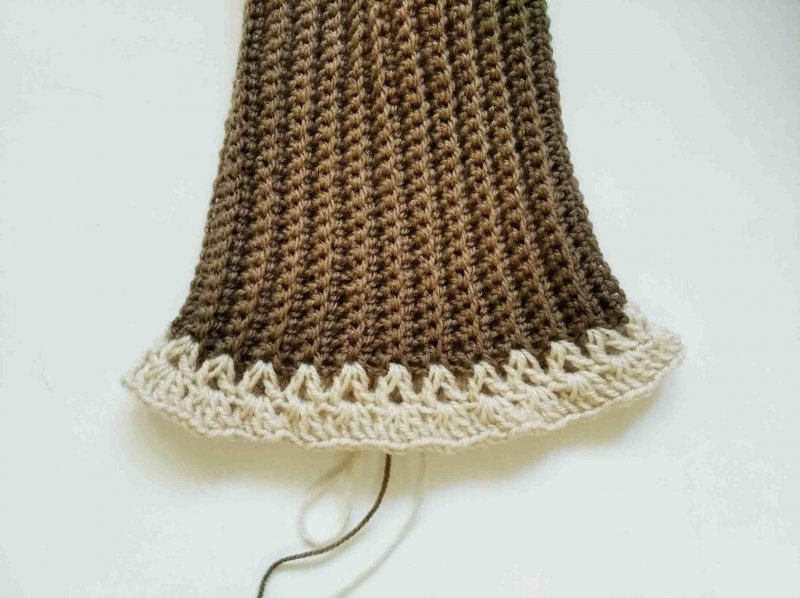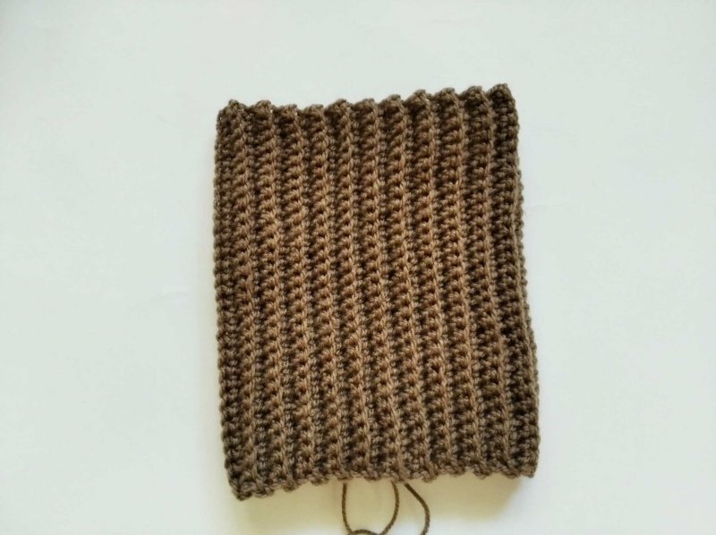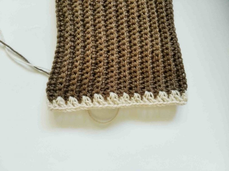 Начинаем вязание с цвета капучино. Набираем цепочку из В/П. Длина цепочки должна быть сантиметров 25-30. И вяжем резинку С/Б/Н за заднюю стенку петель. Вяжем до тех пор, пока длина полотна не будет равна обхвату шеи. То есть полотно должно полностью закрывать шею, как бы оборачивать ее.