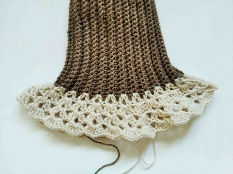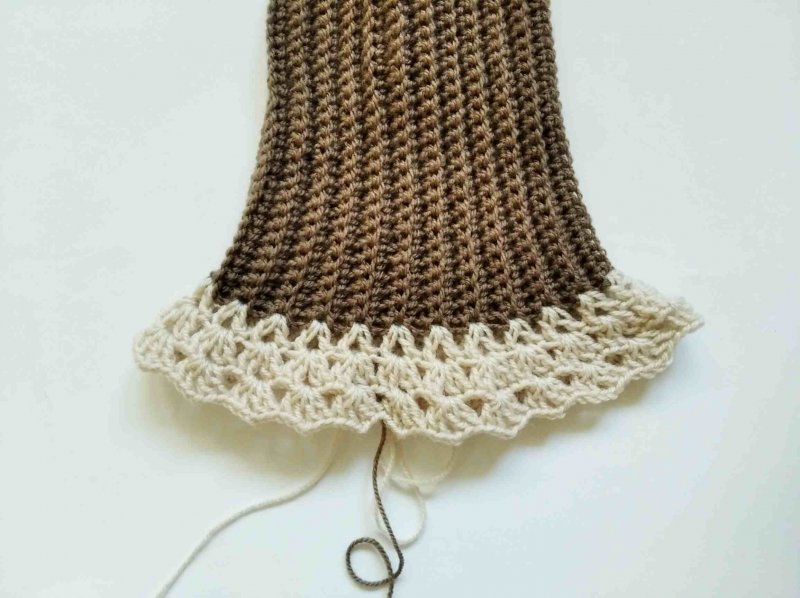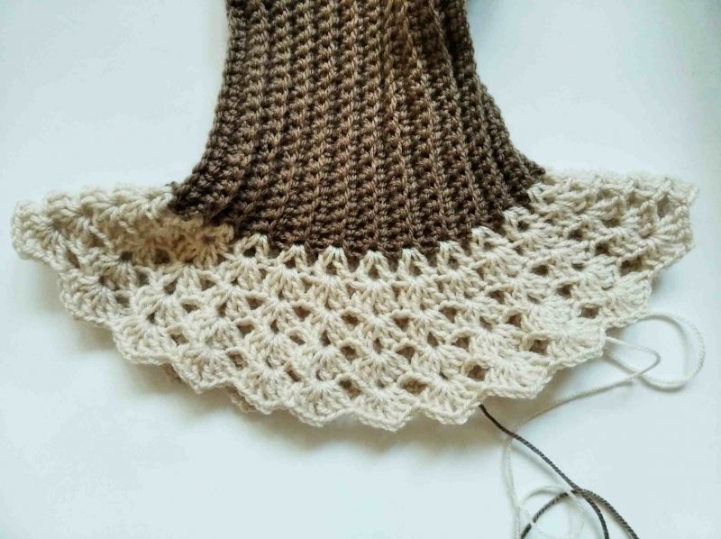Нитку обрезаем и продолжаем вязание нитью цвета капучино. Под арки из 2 В/П провязываем по 8 С/С/Н. Так вяжем до конца ряда. Получается вот такая обвязка края манишки.