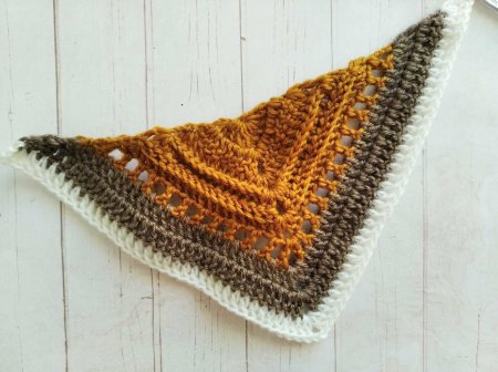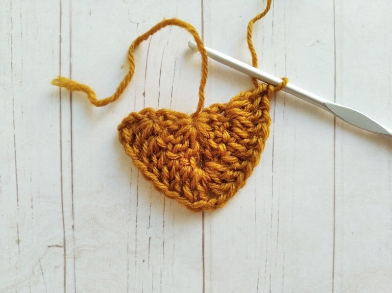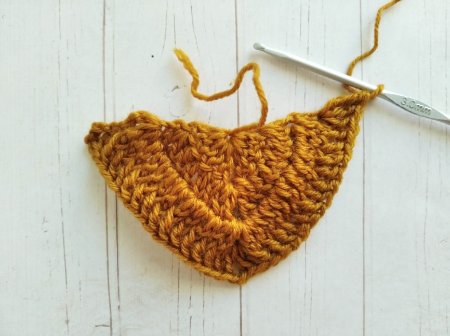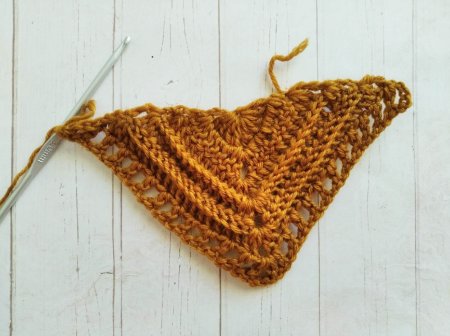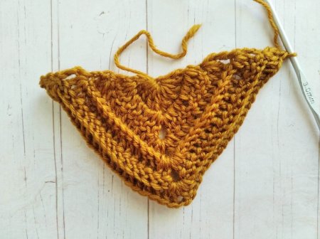 Повторяем предыдущий ряд еще раз. А затем вяжем новый. В начале ряда делаем 4 В/П и вяжем сюда же 2 С/С/Н. Далее до нижнего уголка (где 2 В/П) вяжем выпуклые С/С/Н по 1 в петлю. Под 2 В/П нижнего ряда провязываем 2 С/С/Н, 2 В/П и 2 С/С/Н. Далее продолжаем вязать выпуклые С/С/Н. В последний столбик ряда вяжем 2 С/С/Н и 1 С/С/2Н.