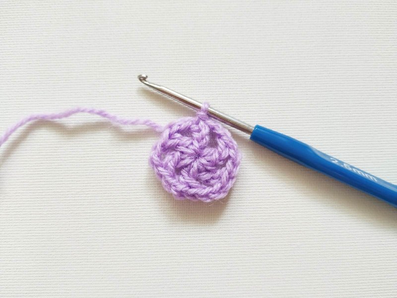 Теперь из пряжи другого цвета свяжем цветок. Формируем скользящую петлю и выполняем 5 петель. Это 1 ссн и 2 петли воздушные по рисунку. Далее в скользящую петлю провязываем 1 ссн. Затем 2 петли и еще 1 ссн. Последний шаг повторим еще 3 раза. Потом делаем 2 петли и выполняем соединительный столбик в 3 петлю из 5, который вязали в начале.