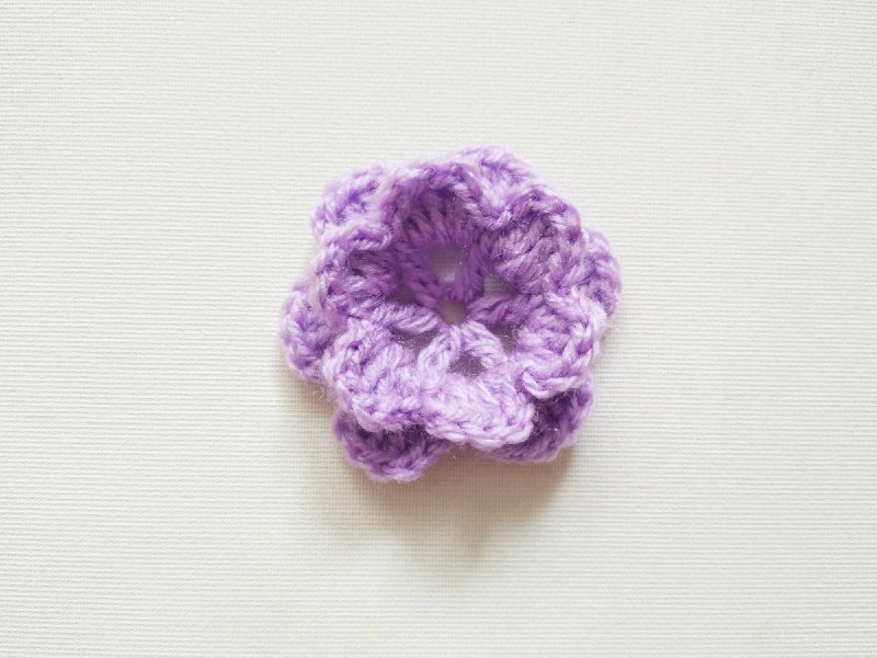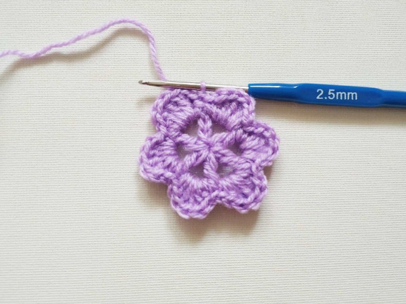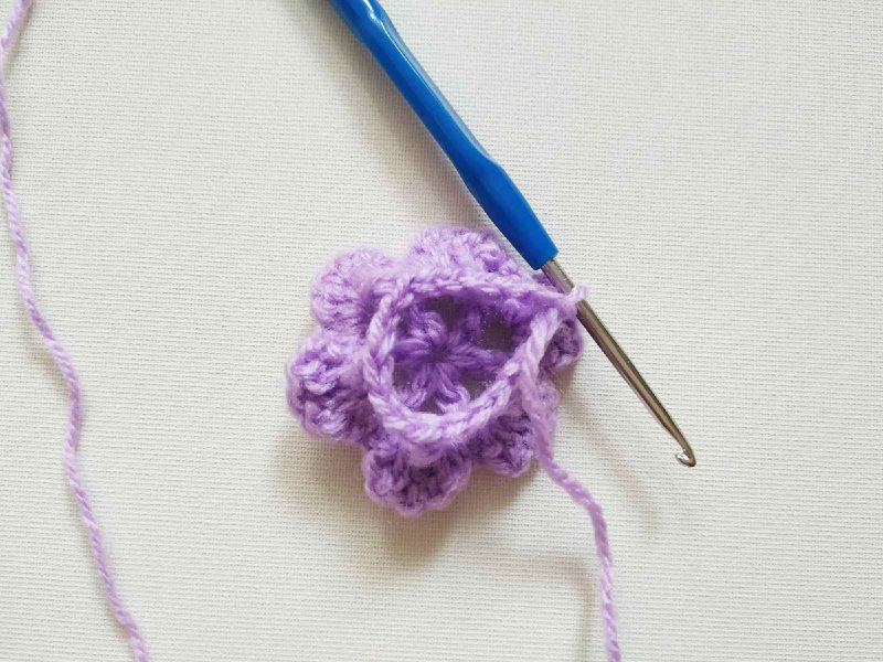 Теперь нам нужно сделать новые 6 арок сзади, чтобы получить новый слой лепестков. Поэтому провязываем соединительный столбик между 1 и 2 ссн, но крючок заводим с изнаночной стороны и вяжем как бы под арку первого ряда. Так мы окажемся на изнаночной стороне цветка. А вот теперь делаем 5 петель и 1 ссн между 1 и 2 ссн следующего лепестка точно так же.