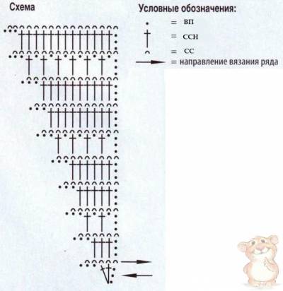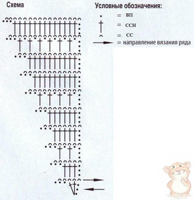 Боснийский бактус вяжется поперек, поворотными рядами. Важной особенностью боснийского вязания является то, что в каждом новом ряду вы вводите крючок за заднюю полупетлю основания, а каждый четный ряд - это ряд соединительных столбиков, или как их еще называют – слепых столбиков. Чем грубее пряжа, тем более рельефным получится изделие.В примере использована пряжа Jeans от YarnArt (хлопок/акрил, 50г/160м), и крючок № 2,5. На изделие понадобилось 3 мотка. Используемые обозначения: ССН – столбик с накидом, СС – слепой столбик, ВП – воздушная петля. Слепой столбик вяжется так – введя крючок в петлю основания, захватываем рабочую нить, и протягиваем ее через обе петли, имеющиеся на крючке. Каждый нечетный ряд начинается с трех воздушных петель подъема. Приступаем к вязанию в соответствии со схемой.