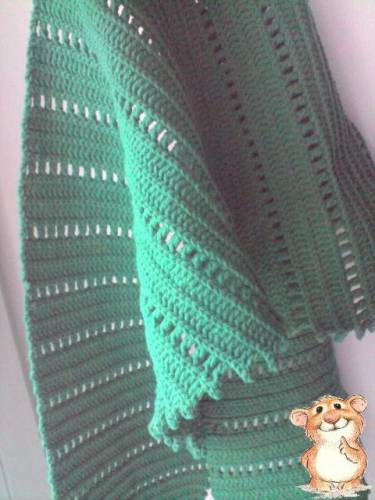 Довязав до нужной длинны (рекомендовано ок. 70 см), провязываем ряд без прибавок, а далее начинаем убавления по тому же принципу что и прибавки, не забывая про формирование бахромы. На этом этапе обе части бактуса необходимо периодически сверять, чтобы они были симметричны. По окончанию вязания остается обвязать длинный ряд бактуса столбиками без накида. Можно так же использовать «рачий шаг».