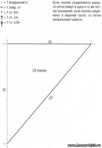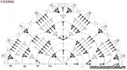 Вязать прямыми и обратными рядами по схеме. Связать цепочку из 5 ВП, заключить её 1 СС в круг и связать 1 раз с 1-го по 8-й ряды. Затем повторять с 3-го по 8-й ряды, продолжая прибавления по смыслу. Закончить работу через 62 ряда от наборного края 9-м рядом схемы.