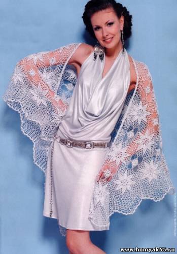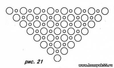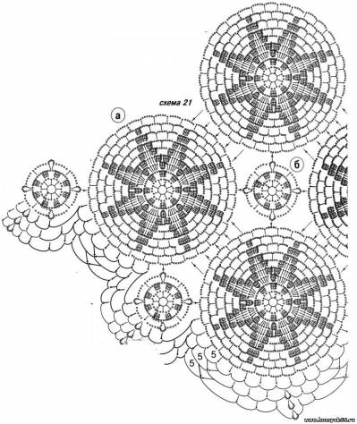 Шаль состоит из отдельных мотивов, соединенных между собой в процессе выполнения последнего ряда. Расположение мотивов смотрите на рис. 21. Свяжите полотно из 36 больших "звезд" по схеме 21а и 28 маленьких "звездочек" по схеме 21б, соединяя их между собой, как показано на схеме 21. Затем выполните обвязку сеткой, делая прибавку вогнутой части полотна. В середину крупных мотивов вшейте бусины. По периметру шали провяжите 3 ряда СБН, выполняя по 8 СБН под каждую арочку из ВП.
