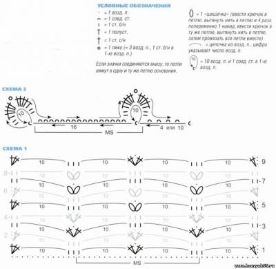 Бахрома: длину бахромы определяет число ВП перед 1 м листиком или число листиков внутри бахрамы. Присоединяется в конце шарфа с помощью 1 СС и вязать 4 или 10 ВП, затем по схеме 2 выполнить сначала 10 ВП для 1-го листика, 1 СС в 1-ю ВП и 16 ВП для перемычки попеременно, закончить 10 ВП для 1 листика. Присоедениться 1 СС к 1-й ВП листика, повернуть и, следуя по стрелкам, объвязать петли из ВП для листиков и перемычку по схеме. Повторить раппорт 1 или 2 раза. $CUT$