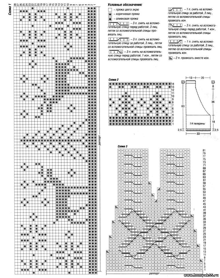 Пелерина выполняется без швов, круговой вязкой. Набираем на спицы №6 (круговые) коричневой пряжей 180 петель,$CUT$ далее переходим на спицы №3,5 и вяжем по кругу 4 ряда резинкой, дальше продолжаем жаккардовым узором в соответствии со схемой 1 на спицах №6. Провязываем по схеме 1 28 рядов, дальше вяжем основной пряжей 3 ряда платочной вязкой, при этом в первом ряду провязываем каждую 5-ю и 6-ю петлю вместе = 150 петель, а в 3-м ряду соответственно провязываем вместе каждую 6-ю и 7-ю петли = 128 петель. Далее продолжаем основной пряжей узор по схеме 3. По этой схеме 3 провязываем 82 ряда, переходим на спицы №3,5 и вяжем еще 7 рядов изн. гладью. После этого закрываем все петли, края не стягиваем. Пелерина готова.Повязка на голову