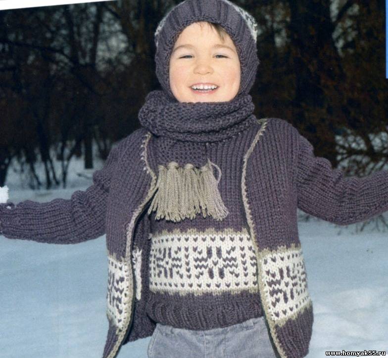Выполняем без швов, по кругу. Набираем на круговые спицы №6 коричневой пряжей 72 петли. Переходим на спицы №3,5 и выполняем 5 рядов резинкой, после чего переходим вновь на спицы №6 и вяжем жаккардовым узором по схеме 2, при этом убавляем в третьем ряду 2 петли = 70 петель. Далее выполняем 14 рядов по хеме 2, переходим вновь на спицы №3,5 и вяжем 5 рядов резинкой коричневой пряжей. При этом прибавляем в первом ряду резинки 2 петли. Закрываем все петли, края не стягиваем. Повязка готова.Комплект для сынишки