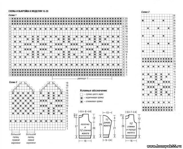 Коричневой пряжей на спицы №6 набираем 25 петель, переходим на спицы №3,5 и вяжем 8 рядов резинкой. Дальше продолжаем на спицах №6 лицевой гладью 3 ряда, после чего приступаем к выполнению жаккардовых узоров по схеме 1, при этом распределяем петли следующим образом: кром., 23 петли раппорта по схеме, кром. После этого деталь до конца вяжем лиц. гладью коричневой пряжей. Пройму выполняем как на спинке. Провязываем 14 рядов от начала убавления для проймы, закрываем для выреза горловины с левой стороны в каждом 2-ом ряду 1 х 4 петли, 2 х 2 петли, 1 х 1 петлю. Провязываем 24 ряда от начала убавлений для пройм и закрываем 11 петель плеча.Правая полочка