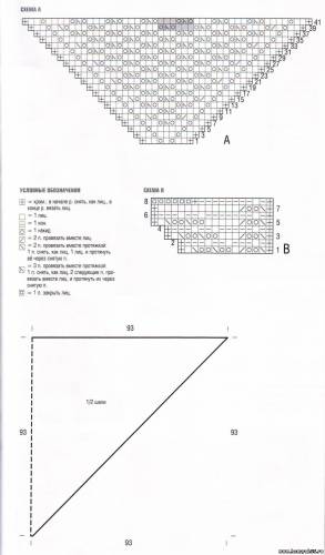 Ажурный узор: вязать по схеме А. В изн. рядах петли и накиды вязать изн. Вязать с 1-го по 42-й ряды, затем повторять последние 4 ряда, при этом с обеих сторон с краев узор вязать, как в последних 6 рядах.