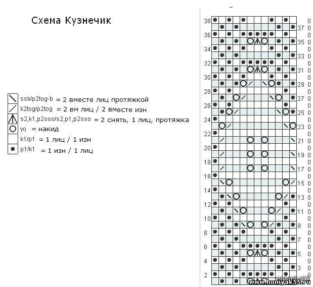 Чтобы кромка получилась ровной, после провязывания подтягивайте каждую вторую петлю потуже. Набрать 45 петель. С 1-го по 5-й ряды вязать узором "Рис". 6-й ряд: 1 лиц. петля, 1 изн. петля, 1 лиц. петля, 1 изн. петля, 1 лиц. петля, вставить маркер, начать схему Кузнечик, читать справа налево, повторить 3 раза, вставить маркер, закончить 1 изн. петля,$CUT$ 1 лиц. петля, 1 изн. петля, 1 лиц. петля. Последующие ряды: петли перед 1-м маркером и после 2-го маркера вязать узором "Рис". Вязать по схеме Кузнечик 11 раз (или до достижения желаемой длины). Вязать следующие 5 рядов узором "Рис".