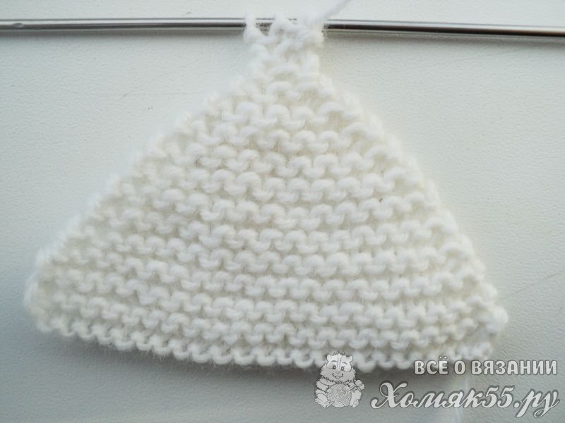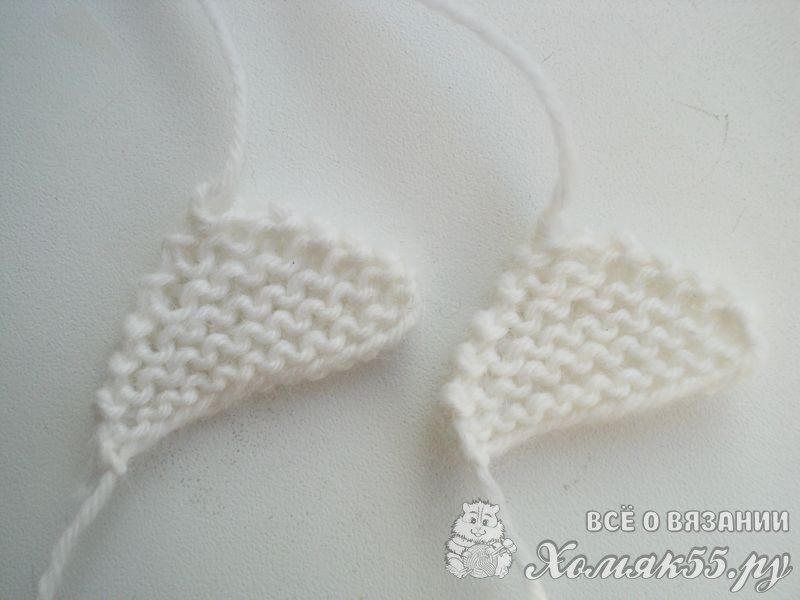 Осталось связать ушки. На спицы набираем тринадцать петель. И вяжем один ряд. Дальше в каждом ряду две последние петли провязываем вместе. Когда останется три петли, провяжем их вместе и стянем узелок.