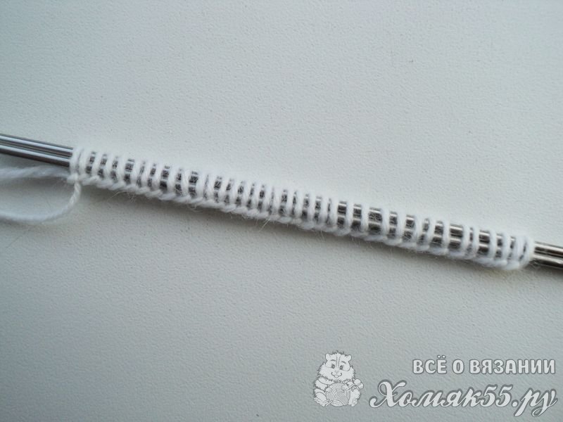 Начинаем вязание с белой нити. Набираем на спицы двадцать шесть петель.