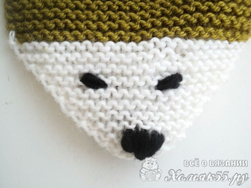 Теперь вышиваем на мордочке глазки и носик черной пряжей. Мордочка – это, то место, где у нас сшиты два треугольника.
