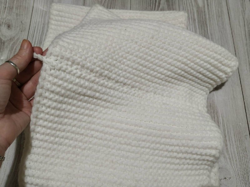 Петельки закроем и затем сошьем 2 стороны получившегося шарфа. Сшивать удобнее всего иголкой с большим ушком. Поэтому понадобится пластиковая трикотажная игла.