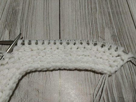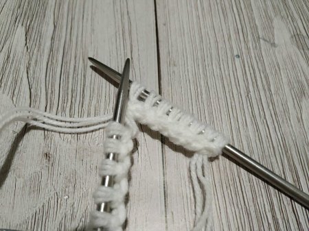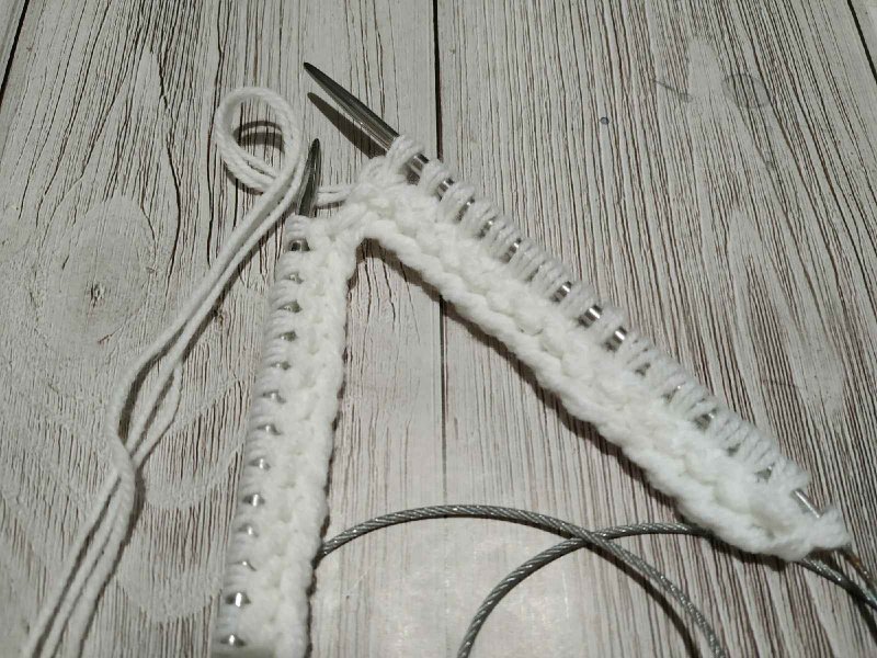 Довязав ряд до конца, поворачиваем спицы и продолжаем вязание, перейдя ко 2 ряду.