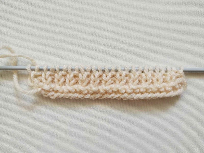 Вяжем новые 2 ряда раппорта. Тут мы просто чередуем 1 лицевую и 1 изнаночную петельку. Вязать так нужно до конца ряда.