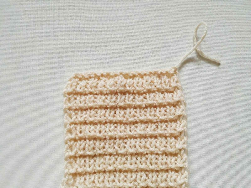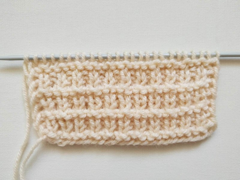 Вот так просто мы связали раппорт из 2 петель в ширину и 4 рядов в высоту. На данном этапе рисунок должен выглядеть вот так.