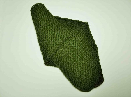 Теперь возьмите левый конец шарфа и подогните его вниз, а правый конец наоборот подтяните вверх. Сложите так, чтобы концы шарфика соприкасались так, как это показано на фото.