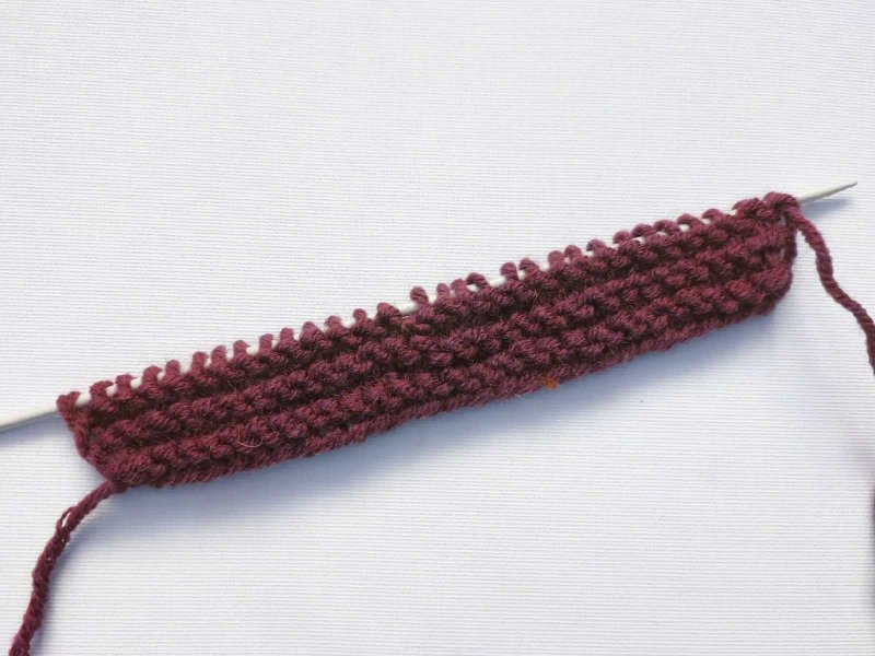 Первые 2 ряда мы вяжем полностью резинкой 2 на 2. То есть тут идет чередование 2 лицевых петелек с 2 изнаночными.