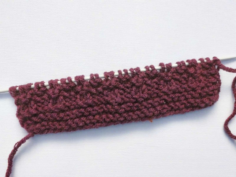 Вяжем платочной вязкой 6 рядов. Затем переходим к основному узору. Этот узор абсолютно одинаков с обеих сторон.