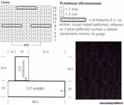 Набрать для шарфа 88 петель и вязать основным узором. Через 161 см (= 458 рядов) от наборного края все петли закрыть. Сложить шарф пополам и отметить середину.$CUT$Для капюшона набрать на круговые спицы 72 петли по 1-й половине шарфа, отступив 10 см от середины переда, симметрично набрать на 2-й половине шарфа еще 72 петли таким образом, чтобы в конце до середины переда осталось так же 10 см. Затем вязать на всех 144 петлях основным узором. Через 98 рядов сложить капюшон пополам и выполнить верхний шов капюшона трикотажным швом. Для сквозной планки набрать с внешней стороны по переднему краю капюшона на 1-е круговые спицы 104 петли и связать 1,5 см лиц. гладью. Все петли отложить.