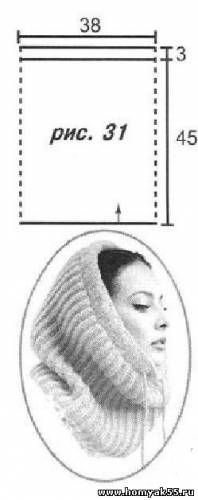 Наберите на спицы расчетное количество петель и вяжите по кругу патентной резинкой полотно высотой 45 см. Продолжайте работу резинкой 2 х 2. Через 3 см провяжите 1 ряд вспомогательной нитью и сбросьте открытые петли со спицы.