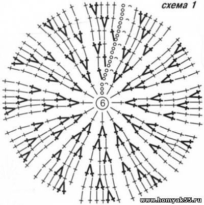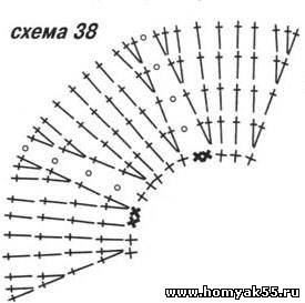 Начните работу с донышка тульи, замкнув цепочку из 6 ВП в круг и вяжите по схеме 1, прибавляя по 12 ССН в каждом ряду. Для формирования круглого донышка продолжите работу, чередуя ряды с прибавками и ряды без прибавок, пока ширина шапочки в сложенном виде не будет равна полуокружности головы. Затем вяжите тулью прямо, необходимую высоту определите примеркой. По низу тульи сделайте обвязку 2 рядами СБН отделочной нитью.Затем вяжите поля расширяюшимся узором по схеме 38. Отделочной пряжей свяжите цветок след. образом: 1-й ряд: в колечко из 6 ВП свяжите 12 СБН. 2-й ряд: выполните по 2 СБН (за ближнюю полупетлю) в каждую петлю предыдущего ряда. 3-й ряд: выполните по 3 ССН (за дальнюю полупетлю) в каждую петлю 1-го ряда. Пришейте готовый цветок к тульи шляпы.
