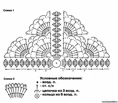 Наберите желтой нитью цепочку из 6 ВП, замкните в кольцо и вяжите по схеме 1 в длину 33 см. Со стороны лица обвяжите край косынки белой нитью 2 рядами СБН и 1 рядом арочек из 3 ВП. Заднюю часть косынки обвяжите по краю белой нитью по схеме 2.