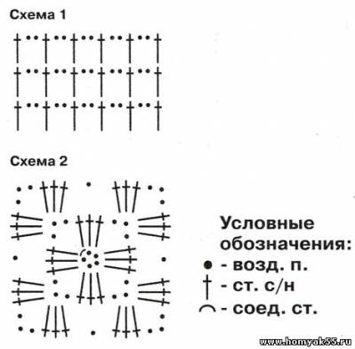 Наберите 6 ВП, замкните цепочку в кольцо, в центр кольца ввяжите 12 ССН. Далее вяжите круг диаметром 11-12 см, равномерно прибавляя в каждом ряду по 12 ССН. Затем вяжите без прибавлений 5 рядов СБН и 3 ряда узором по схеме 1 и 3 ряда ССН. После этого вывяжите мотивы по схеме 2, соединяя их между собой в процессе вязания последнего ряда.Провяжите еще 4 ряда ССН и 5 рядов СБН. Края шапочки обвяжите красной нитью СБН с «пико». Скрутите 3 шнура, переплетая красную и желтую нити, вставьте в отверстия узора (см. фото). $CUT$