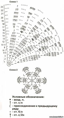 Наберите цепочку из 10 ВП (воздушных петель), замкните в кольцо. В центр кольца ввяжите 21 ССН (столбик с накидом). Далее вяжите по схеме 1. Затем вяжите СБН (столбики без накида), выполняя убавления (5 петель, 7 петель, 10 петель) по кругу до необходимого размера (обхвата головы). После этого провяжите 3 - 5 рядов без убавлений.