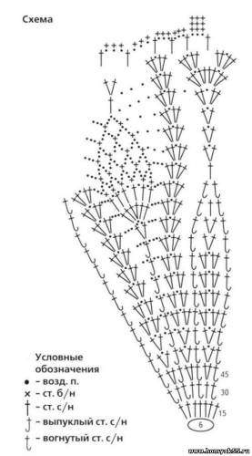 Наберите 6 ВП, замкните в кольцо. В центр кольца ввяжите 15 СБН, в следующем ряду из каждого столбика вывяжите 1 обычный ССН и один выпуклый ССН. Далее вяжите по схеме.