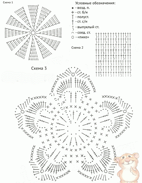 Наберите цепочку из 5 ВП, замкните ее в кольцо. 1-й ряд – 3 ВП для подъема, ввяжите в кольцо 11 ССН. Далее вяжите 12 рядов по схеме 1. С 13-го по 15-й ряды вяжите ровно, без прибавок. Далее вяжите резинкой по схеме 2 с 16-го по 31-й ряды.Край готовой шапочки обвяжите одним рядом «рачьего шага». Цветок вяжите по схеме 3. Края цветка обвяжите «рачьим шагом». Готовый цветок пришейте к шапке.