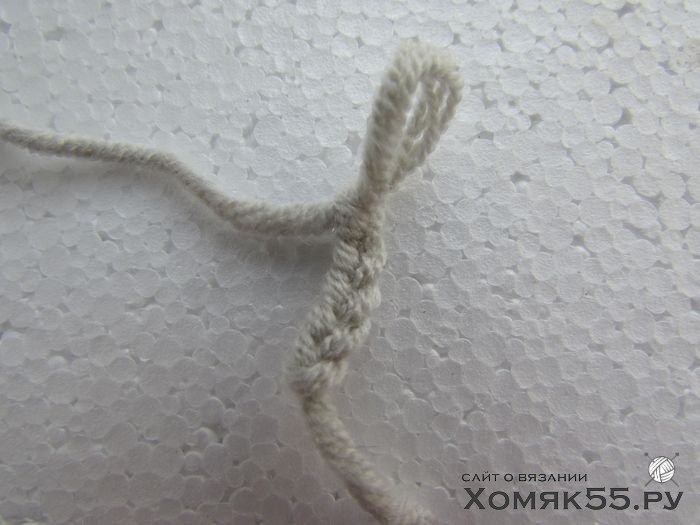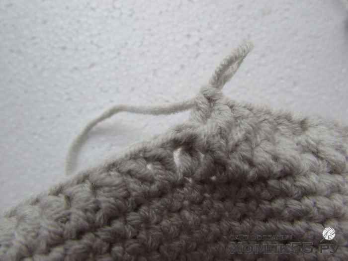 Ушки вяжутся следующим образом: набираем 5 воздушных петель, замыкаем их в кольцо, а затем вяжем столбики без накида только до половины кольца.
