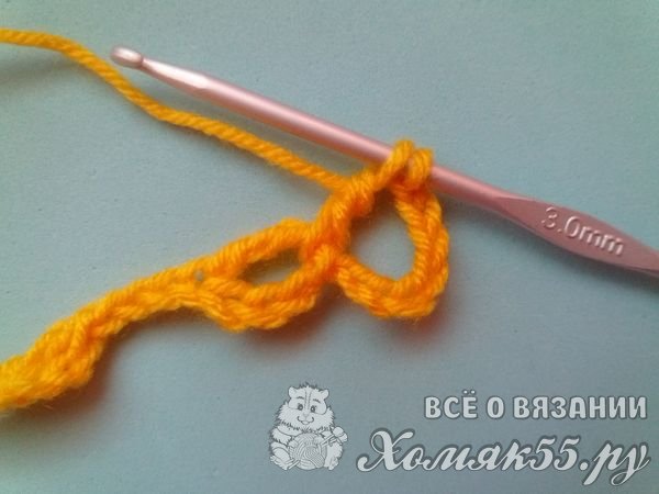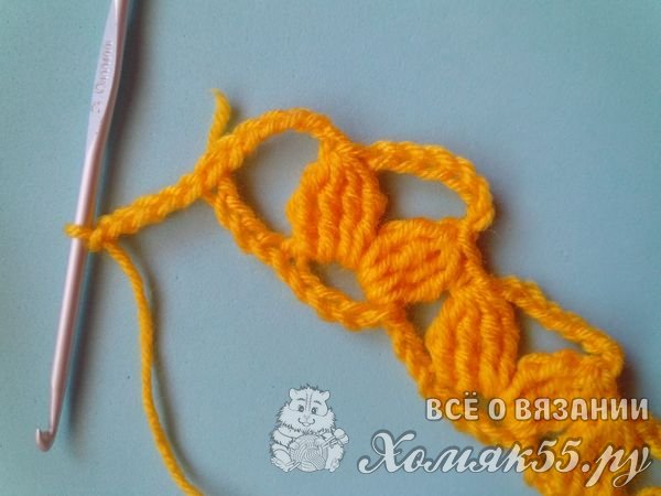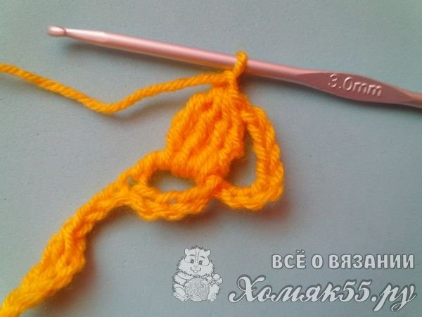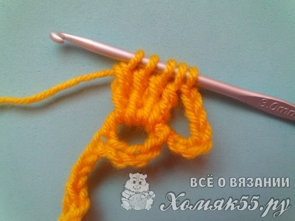 В конце выполняем три ВП. И еще набираем пять ВП. Теперь мы вывязываем в полученные колечки С2Н. Вяжем их не до конца. То есть на крючке должно остаться две петельки.