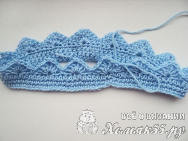 Выправляем наше вязание и начинаем вывязывать края короны. Теперь выполняем 3 ВП и сюда же вяжем 2 ССН.