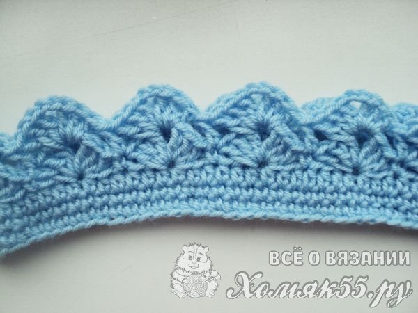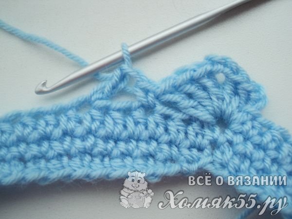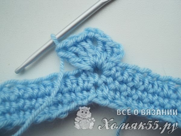 Можно оставить корону и в таком виде. Но мы провяжем еще ряд, чтобы немного ее поднять. Соединяемся во 2-ю петлю. Делаем 3 ВП и в арочку вяжем 2 ССН. Снова 2 ВП и сюда же еще 3 ССН. В СБН предыдущего ряда провязываем 1 ССН. Далее вязание будет повторяться.