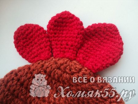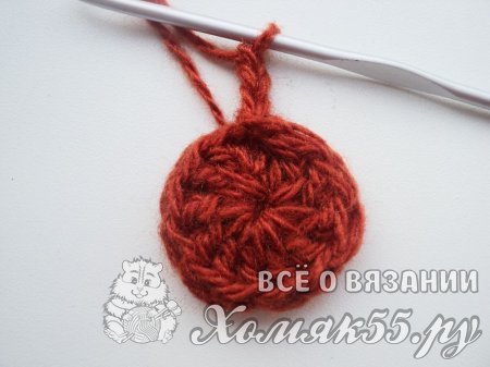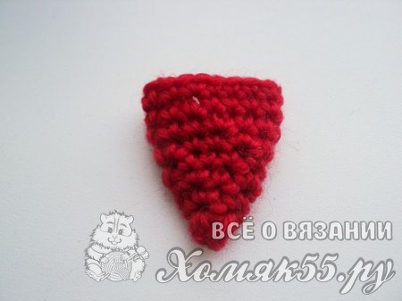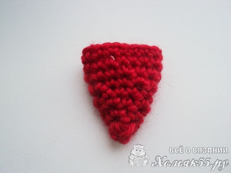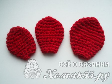 Он будет состоять из 3-х частей. Чтобы связать самую большую часть, возьмем красную пряжу и сформируем кольцо из 6-ти петель. Далее прибавляем в каждую петлю. Вяжем СБН. В новом ряду прибавим через каждую 1 петлю и так далее, пока не получим 30 петель. Затем свяжем 2 ряда без изменений детали. Потом убавляем через каждые 3 петли. Вяжем ряд без убавок. Далее убавку делаем через каждые 2 петли и провязываем еще 2 ряда без изменений. Следующие две части вяжутся так же, только рядов с прибавкой будет меньше. Во 2-ой части на 1 прибавочный ряд. То есть всего будет 24 петли. Вяжем 3 ряда по 1 СБН в каждую петлю. Затем убавляем через каждые 2 петли. 1 ряд без убавок. Убавляем через 1 петлю. Вяжем 3 ряда. 3-я деталь вяжется так же, только в конце не 3 ряда, а всего 1.