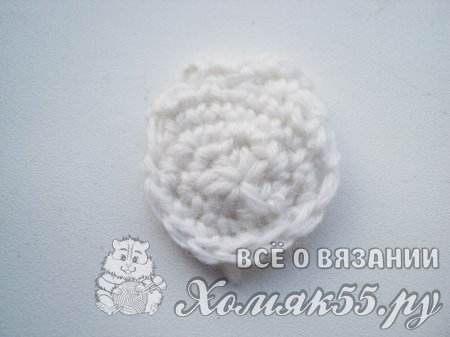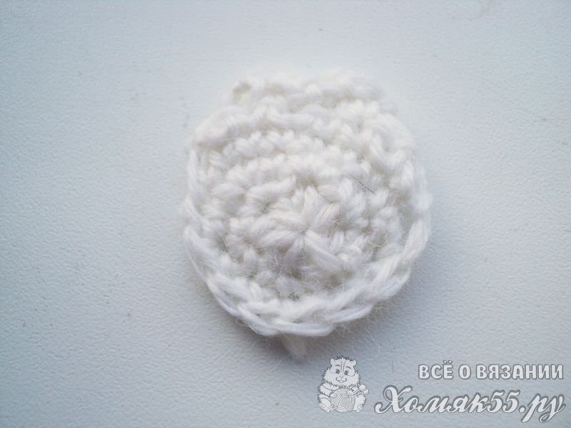 Для них нужна белая пряжа. Формируем кольцо из 6-ти петель. Прибавляем двумя рядами до 18 петель. Затем вяжем 9 СБН. Разворачиваемся, делаем 1 ВП и делаем убавку, далее вяжем по 1 СБН. Последние 2 петли тоже провязываем убавкой. Разворачиваемся. 1 ВП. Снова вяжем, убавляя в первую и последнюю петли. Так вяжем до конца.