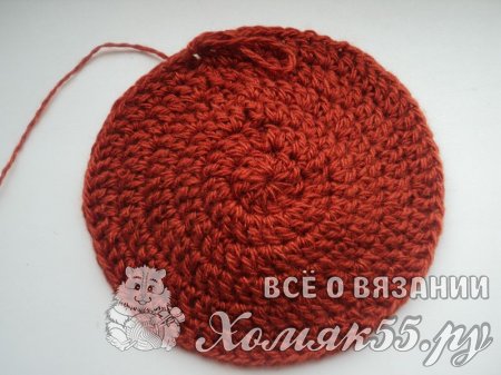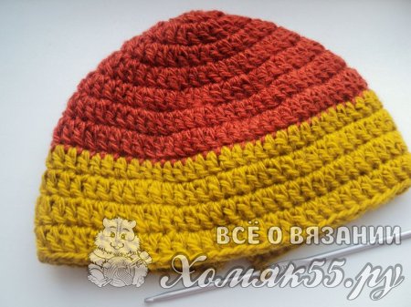 Дальше вяжем еще 1 ряд, выполняя по 1 ССН в каждый столбик нижнего ряда. Теперь, при соединении сменим цвет пряжи. Выполняем 4 ряда ССН по 1 в каждый столбик.