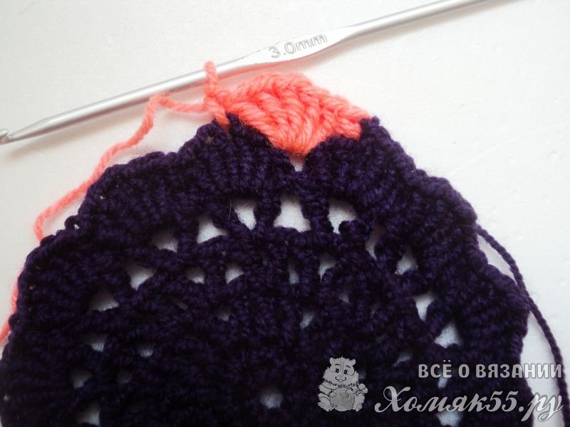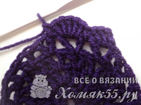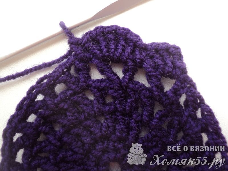 В конце довязываем два ССН в то место, откуда начали вязание и СС провязываем в третью петельку подъема. Так мы оказались в середине веерочка.