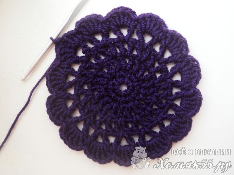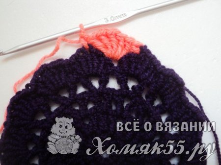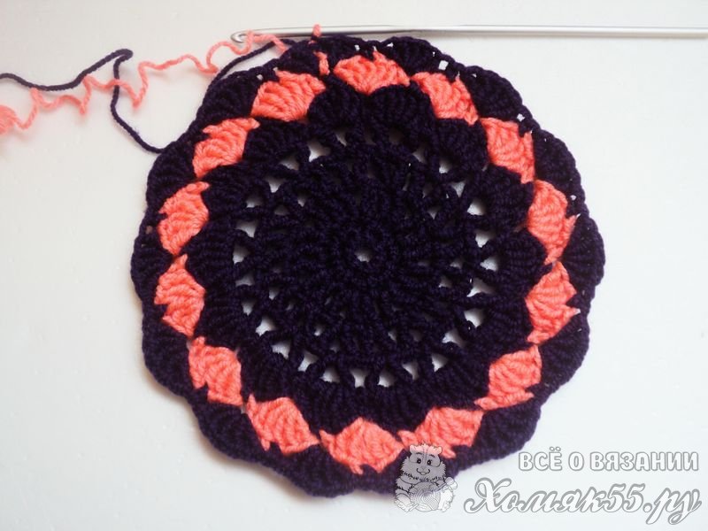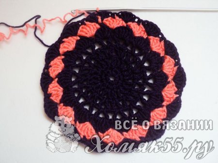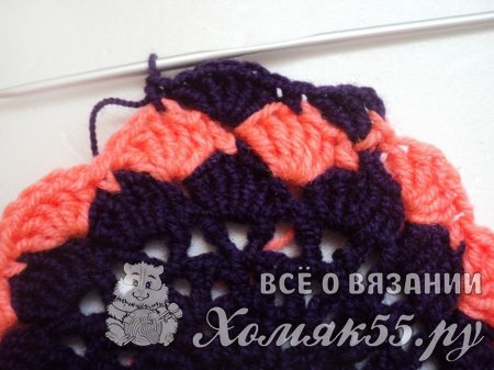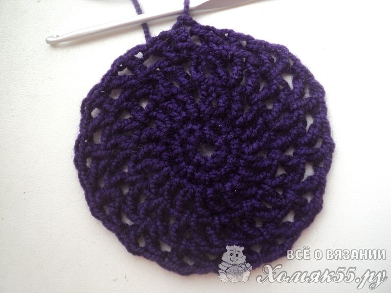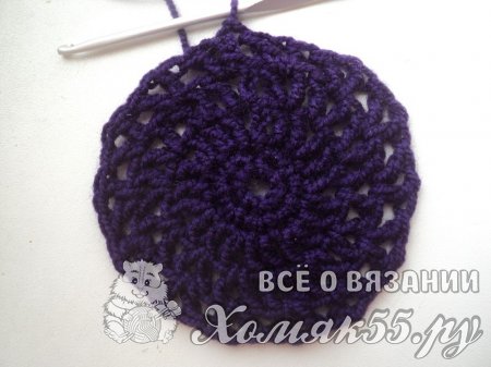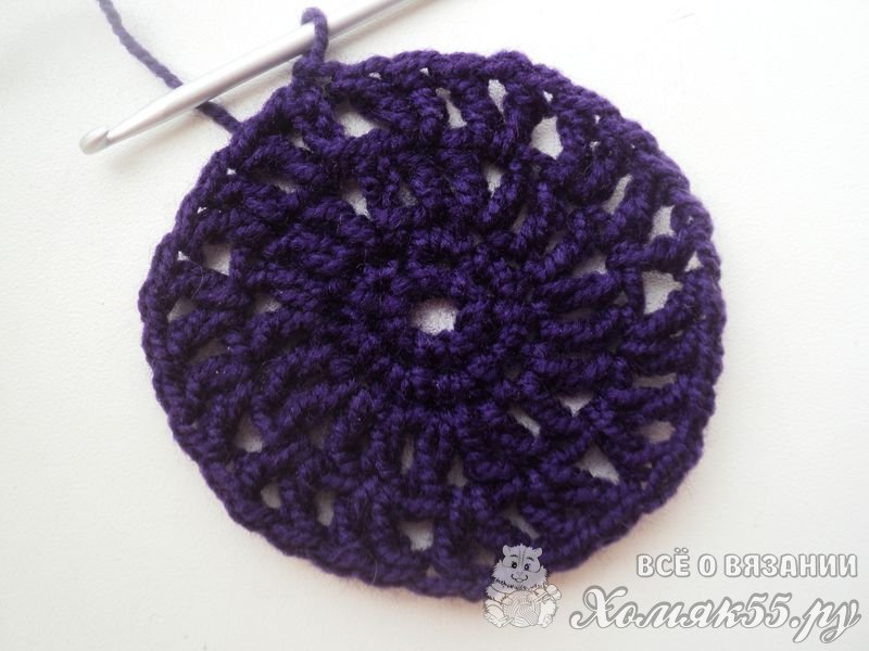 Такого донышка достаточно для обхвата головы 40-41 см. Если нужно больше, то просто повторяем еще рядочки, начиная с третьего. То есть вяжем V-элементы в V-элементы и между ними по ССН.