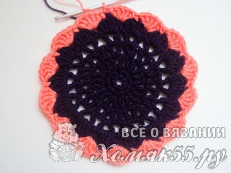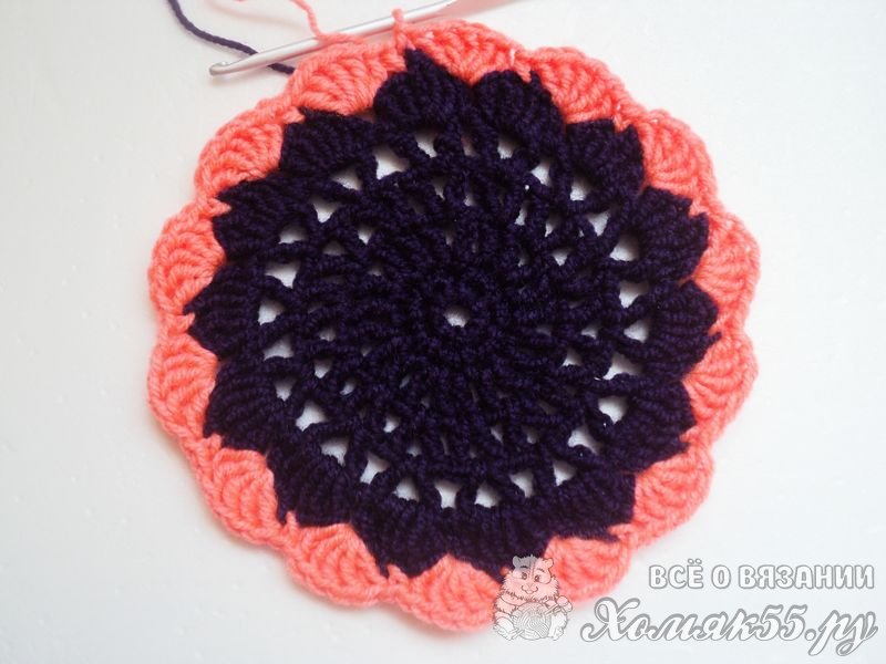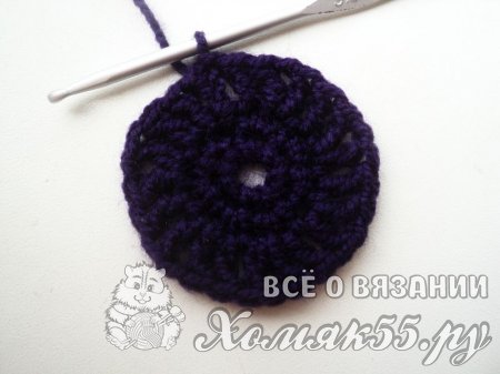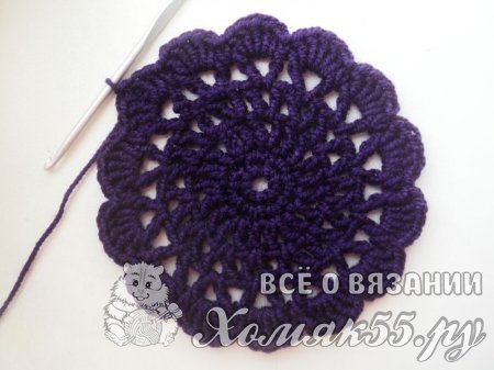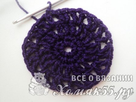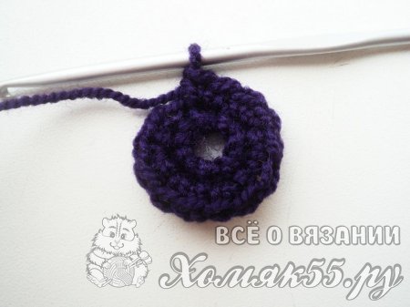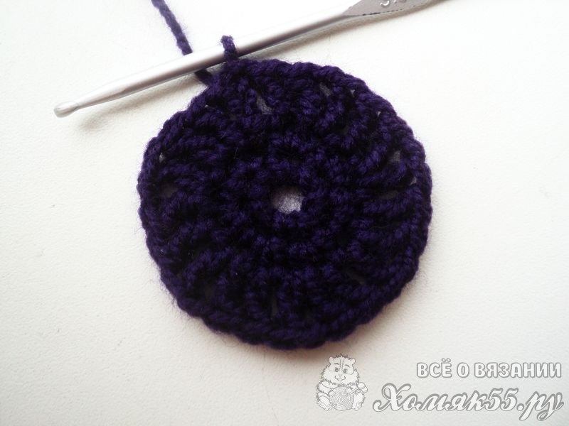Теперь проходим в серединку V-элемента и вяжем сюда точно такой же элемент из двух ССН и одной ВП между ними. В ССН выполняем два ССН. И так повторяем до конца ряда. Соединяем конец и начало нашего рядочка.