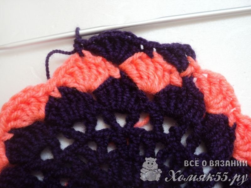 Снова меняем нитку и вяжем три ССН. Первый из них это три ВП. В серединку нижнего веерочка выполняем СБН. И далее в нижний СБН вяжем веер из пяти ССН. Так вяжем до конца ряда. В конце снова провязываем два ССН в то место, откуда мы начали вязание и вяжем в третью петлю подъема СС.