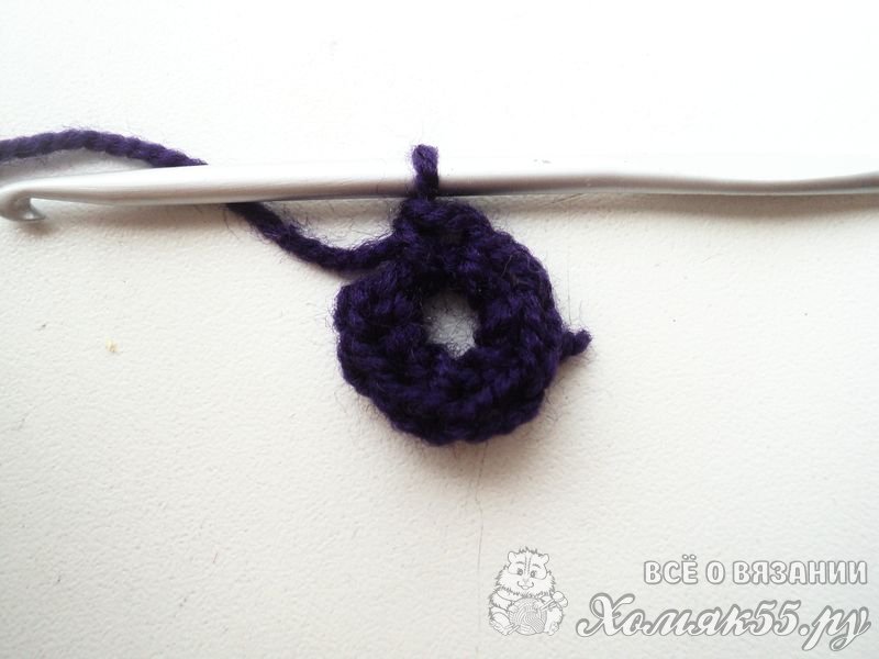 Вяжем четыре ВП (воздушные петли). И теперь выполним СС (соединительный столбик) в самую первую петельку, чтобы сформировать колечко. В него мы провязываем семь СБН (столбиков без накида).
