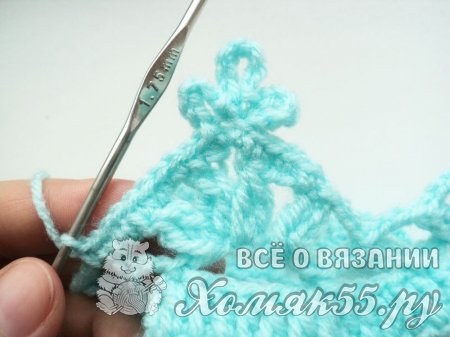 Далее делаем 3 воздушные петли и выполняем 1 соединительный столбик в 3-ю петли цепочки из 5 петель. Затем снова 3 воздушные и вяжем элемент из 4 пар столбиков с накидом под арку из 8 петелек. Так вязание продолжаем до конца этого ряда.