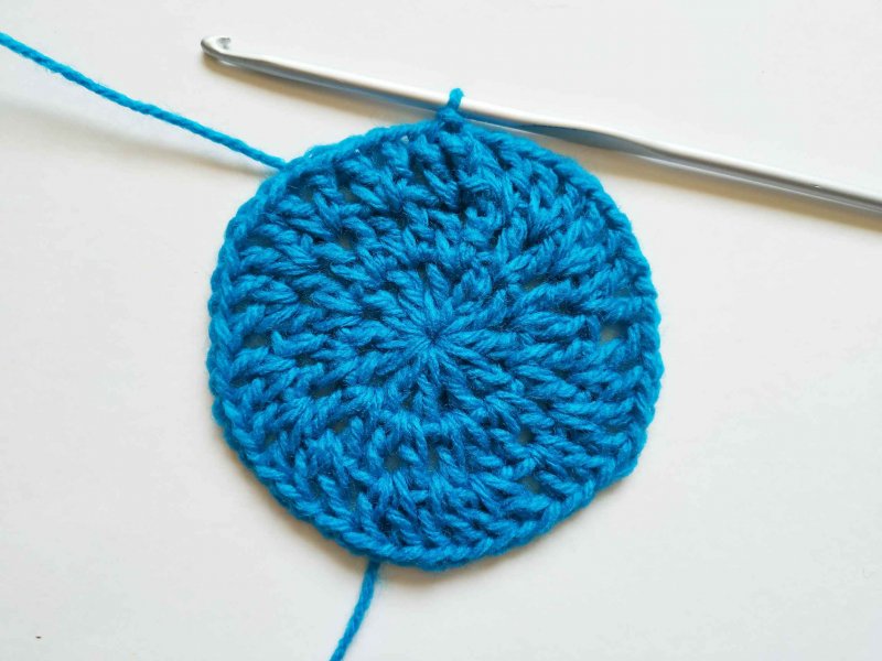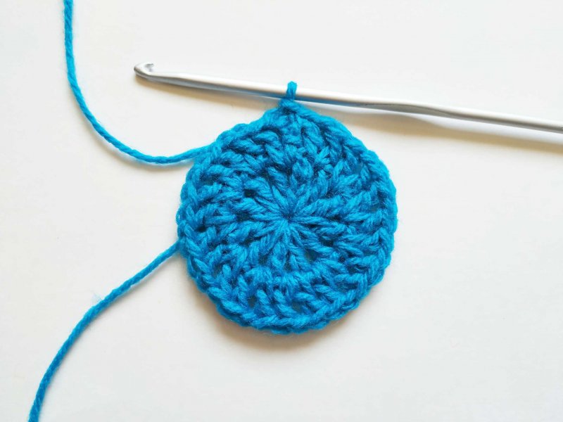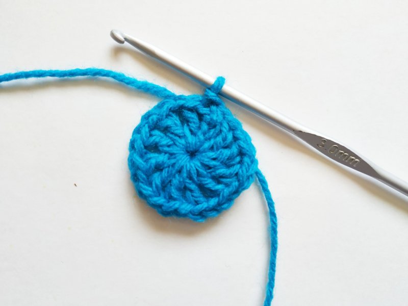 Затем в следующие 2 галочки тоже вяжем по 1 галочки. И опять галочку выполняем между элементами. Так провязываем до конца ряда, тем самым увеличив количество галочек и диаметр донышка, соответственно.