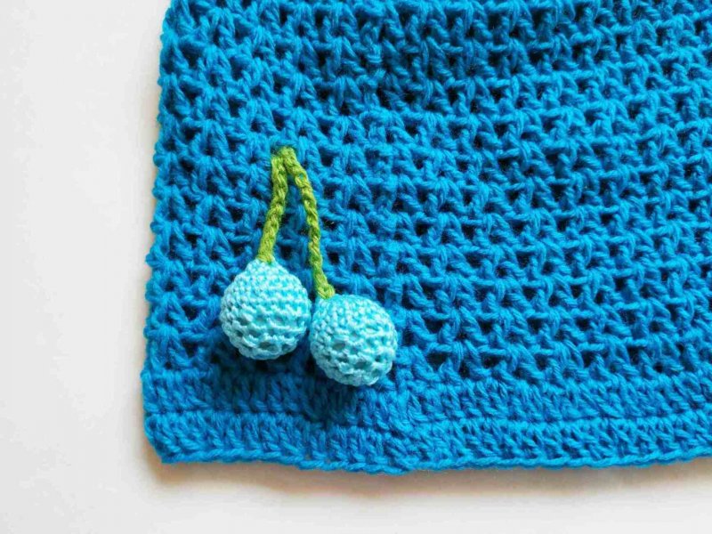 Украсим такую шапочку обвязанными бусинками. Обвязывать их будем нитью мулине. Вяжем 6 стбн в скользящую петлю, затем прибавляем в каждую петельку. Далее выполняем 3 ряда по 12 стбн. Убавляем в каждую петлю и стягиваем отверстие. Прикрепляем зеленую нитку и вяжем 15 возд. п.