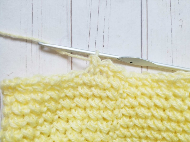 То есть мы провязываем сначала вторую петлю от крючка, а затем первую. Получаются перекрестные столбики без накида. Так вяжем до конца ряда.