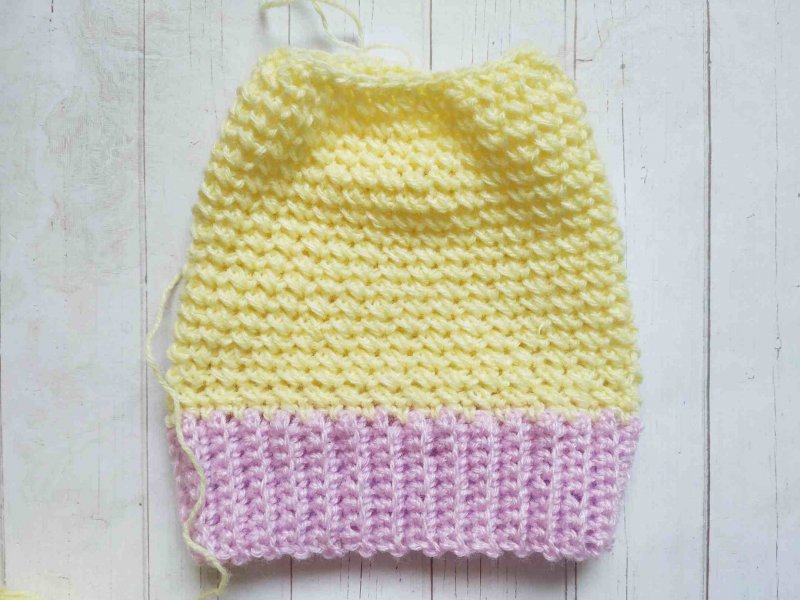 Теперь будем вязать пряжей другого цвета. Но можно сделать шапку и одноцветной. Провязываем ряд столбиками без накида по кругу. Количество петелек должно быть кратно 2.